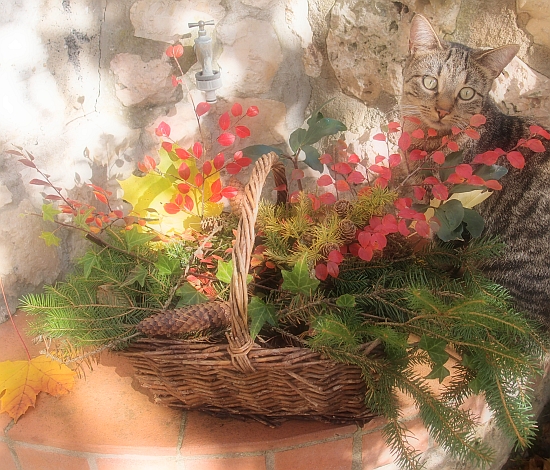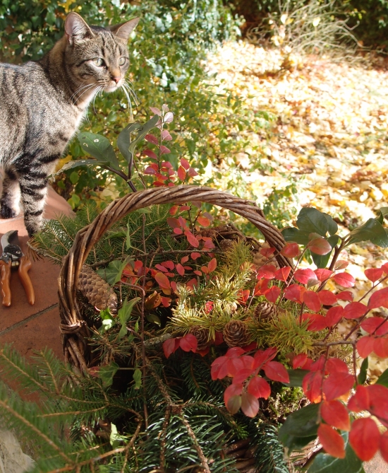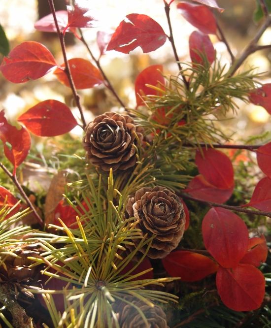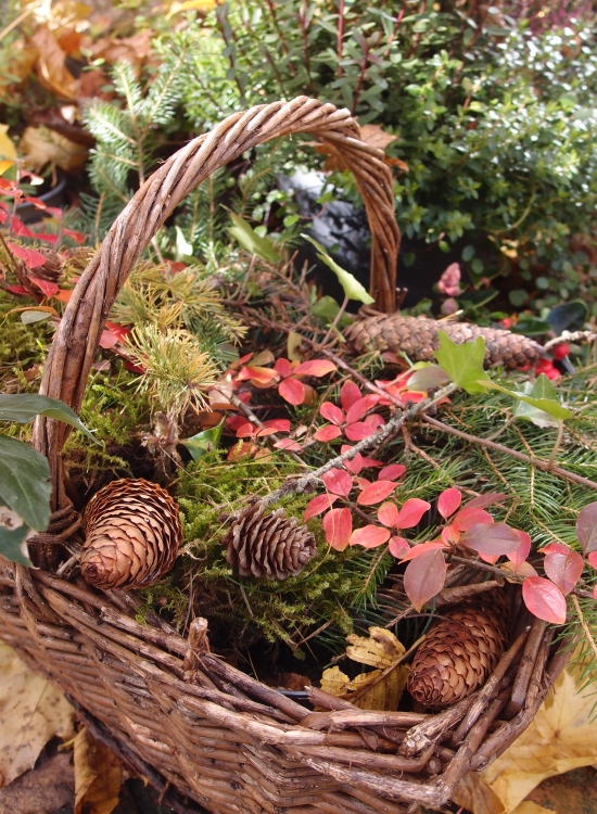 Aus dem Wald hatte ich neulich ein paar herabgefallene Tannenzweige und Zapfen mitgenommen. Dazu ein paar Blätter von meinem Ahorn, Moos, Efreu und diese wunderschönen Zweige der Berberitze, deren winzige Blätter sich im Herbst auch immer so wunderschön verfärben, wie ihr sehen könnt. Die habe ich zusammen in ein Körbchen gesteckt. Ich liebe es.